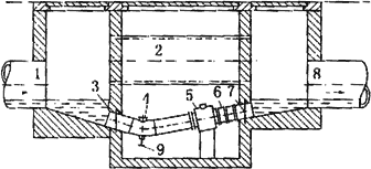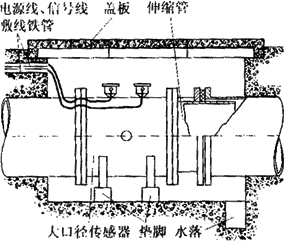 由于大口徑管道在多數(shù)場(chǎng)合下是埋在地下的,因此大口徑傳感器在安裝前應(yīng)做好水泥地坑。圖6-19所示是在給排水系統(tǒng)中常見(jiàn)的安裝形式。水泥地坑應(yīng)有足夠的活動(dòng)空間,側(cè)壁埋有敷設(shè)電纜的鋼管,上有蓋板防止雨淋,下有泄水管以免坑內(nèi)積水而使傳感器侵水。為了拆裝方便,傳感器應(yīng)放在墊腳上,且在下游側(cè)裝有活絡(luò)的伸縮管。圖6-20是電磁流量計(jì)在地下水泥管污水排放系統(tǒng)中的安裝實(shí)例。