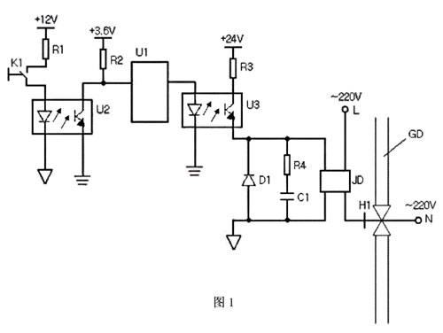 所述第二光耦U3的負輸入端接地,其正輸出端經(jīng)另一分壓電阻R3接24V正電源,其負輸出端串接繼電器.JD的線圈到地。