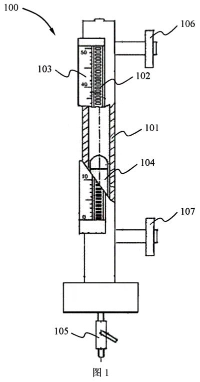 此外,如圖1所示,根據(jù)本實用新型的一個優(yōu)選實施例,在上述的保溫型塑料磁翻板液位計100中,所述液位計主體101的底部設(shè)置有一排污閥105。該排污閥105可用于排干所述中空管道內(nèi)的污濁的紅色液體,以便進(jìn)行換液。