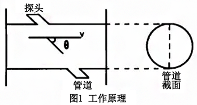 (3)測量原理為速差法,與傳統(tǒng)的時(shí)差法有明顯的區(qū)別,圖1表示超聲波的檢測的原理,超聲波在兩個(gè)傳感之間的順流和逆流的傳播時(shí)間(ts,tn)分別為: