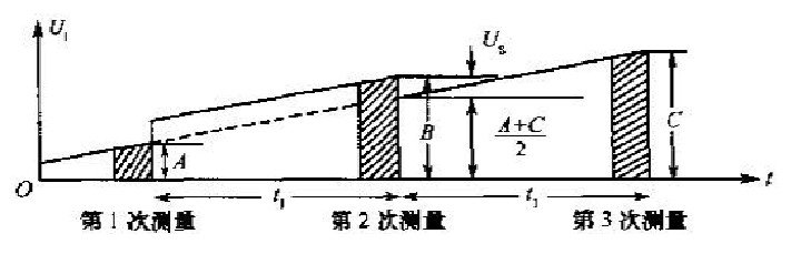 (a)方波磁場(chǎng)的感應(yīng)強(qiáng)度(理想情況), (b)由電扳2個(gè)電壓Ue的測(cè)量值差得出有用電壓Uu.。 當(dāng)溫度或被測(cè)介質(zhì)的化學(xué)關(guān)系發(fā)生變化時(shí),電化學(xué)干擾電壓不再保持恒定,而是以一定的時(shí)間間隅(幾秒到幾分)變化。因?yàn)榧兓瘜W(xué)直流干擾電壓變化的時(shí)間遠(yuǎn)大于測(cè)量周期的時(shí)間,所以在此間隔中這種變化可近似看做與時(shí)間呈線性關(guān)系的變化。這樣,在測(cè)量時(shí)采用簡(jiǎn)單的線性插補(bǔ)方法可使電化學(xué)干擾電壓的變化和由此所引起的誤差(見圖3.8)得到抑制。為了達(dá)到此目的,在磁場(chǎng)關(guān)斷時(shí)測(cè)得第1個(gè)值是電化學(xué)直流干擾電壓(A值);然后接通磁場(chǎng);當(dāng)磁場(chǎng)感應(yīng)強(qiáng)度達(dá)到*大值之后,測(cè)得的第2個(gè)值是平均變化的電化學(xué)直流干擾電壓和有用信號(hào)疊加值(B值)。當(dāng)磁場(chǎng)再次關(guān)斷時(shí),量測(cè)的第3個(gè)值是經(jīng)間隔時(shí)同后上升的電化學(xué)直流干擾電壓(c值)。2個(gè)不同的電化學(xué)直流干擾電壓(A值和c值)的平均值與B值的疊加信號(hào)相減便獲得有用的電壓信號(hào)值Ub。