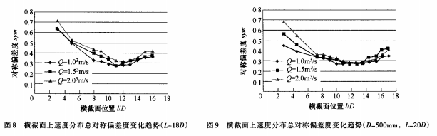 圖7以曲線的形式給出了不同橫截面速度分布總對稱偏差度的變化趨勢。從圖7可以看出,沿著直管流動方向,總對稱偏差度先減小后增大,*小值在ι=lOD(Q=1.0m3/s)和11D(Q=1.5m3/s和2.0m3/s)位置處。這是由于在靠近上游彎管和下游彎管的直管,流動受彎管的影響,且上游彎管對直管內(nèi)速度分布影響較大。ι=lOD位置的速度總對稱偏差度比ι=5D位置的降低了很多,流量Q=1.0、1.5和2.0m3/s3個工況下,速度總對稱偏差度分別減小了0.3065、0.1642/0.1907。由此可見,由于速度分布對稱度大幅度的提高,電磁流量計(jì)安裝在ι=lOD位置時流量計(jì)量的準(zhǔn)確度將大大高于電磁流量計(jì)安裝在ι=5D位置。
