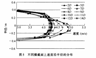 不同橫截面(ι=2D、5D、6D、……、14D)上速度沿著半徑的分布見圖5。從圖5可以看出,在ι≤7D的橫截面上,速度分布明顯不對稱,且隨著ι的增大,速度軸對稱情況逐漸好轉(zhuǎn);在其它橫截面上,速度分布趨于對稱。