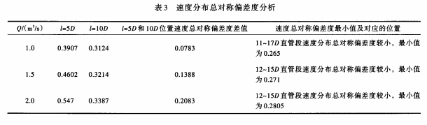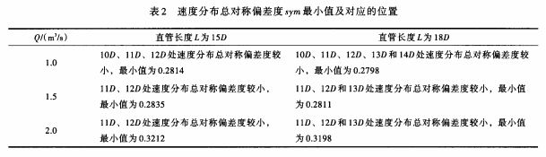 4.1.3 800mm內(nèi)徑電磁流量計(jì)測量管路設(shè)計(jì)分析 根據(jù)上述計(jì)算結(jié)果統(tǒng)計(jì)出不同過流量、不同直管長度,速度分布總對稱偏差度的*小值及對應(yīng)的位置,見表2。從表2可以看出,當(dāng)直管長度L取12m和14.4m時,均有部分位置的速度分布總對稱偏差度較小,且兩種直管長度下總對稱偏差度*小值相差很小。以Q=2.0m3/s為例,L取12m和14.4m時,總對稱偏差度*小值分別為0.3212和0.3198,差值為,0.0014。由此可見,當(dāng)測量直管長度達(dá)到一定值時,繼續(xù)延長測量直管長度并不能顯著改善管內(nèi)速度的軸對稱分布情況。