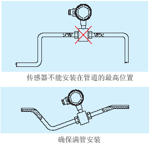 傳感器不能安裝在管道的*高位置,這個(gè)位置容易積聚氣泡。
