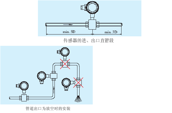 當(dāng)出口為放空狀態(tài)時(shí),傳感器不應(yīng)安裝在管道放空之處,應(yīng)安裝在較低處。傳感器安裝在管道下方處時(shí),應(yīng)保證傳感器內(nèi)被液體充滿,不能出現(xiàn)空管狀態(tài)。