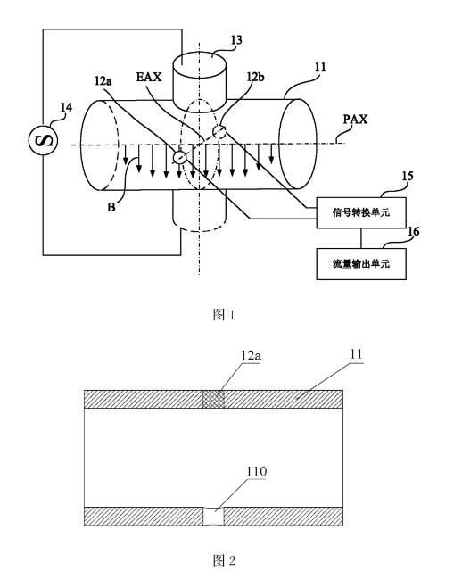 圖1顯示了現(xiàn)有技術(shù)中的一種電磁流量計(jì)的結(jié)構(gòu)。如圖1所示,所述電磁流量計(jì)包括:流動有被測流體的測量管11,和與被測流體相接觸且對向配置在測量管11上的電極12a、12b,向被測流體施加磁場的勵(lì)磁線圈13,向勵(lì)磁線圈13供給勵(lì)磁電流、使其產(chǎn)生磁場的電源單元14。另外,所述電磁流量計(jì)還包括:與電極12a、12b連接用于檢測電極12a、l2b之間的感應(yīng)電動勢的信號轉(zhuǎn)換單元15,從由信號轉(zhuǎn)換單元15檢測出的電極間電動勢計(jì)算出被測流體的流量的流量輸出單元16應(yīng)用所述電磁流量計(jì),當(dāng)流體在測量管11中穿過由勵(lì)磁線圈13產(chǎn)生的磁場流動時(shí),根據(jù)法拉第定律,就會在電極12a、12b上產(chǎn)生感應(yīng)電動勢,流體的平均流速與電極處感應(yīng)出的電壓之間具有線性關(guān)系,這一關(guān)系可以用下述公式表示:E=K*B*舉V,其中E為所產(chǎn)生的感應(yīng)電壓,K為比例常數(shù),B為磁場強(qiáng)度,D為導(dǎo)管直徑,而V為傳導(dǎo)型流體的平均流速這樣,利用信號轉(zhuǎn)換單元15和流量輸出單元16,即可測得與所述感應(yīng)電動勢對應(yīng)的流體的流速,進(jìn)而獲得流體的流量陶瓷管電磁流量計(jì)傳感器有很多優(yōu)點(diǎn),但電極密封是一個(gè)很大難題。圖2為圖1中沿著與勵(lì)磁線圈13產(chǎn)生的磁場相垂直的平面用以顯示電極布置的剖示圖。如圖2,測量管11設(shè)有電極插孔110,所述電極插孔110為圓柱形或圓錐形,其厚度大致與測量管11的壁厚相當(dāng),電極(在這里僅標(biāo)示出電極12a)內(nèi)嵌于測量管11的電極插孔110中。然而,圖2所示中的電極,只有少數(shù)廠家具備特殊的燒結(jié)技術(shù),在高溫高壓環(huán)境下制作出電極以確保電極不滲漏,實(shí)現(xiàn)難度極大。而采用0型圈等機(jī)械裝配密封,由于陶瓷材料表面一定厚度會變湖,使用時(shí)間一長,絕緣性就會下降,影響測量精度