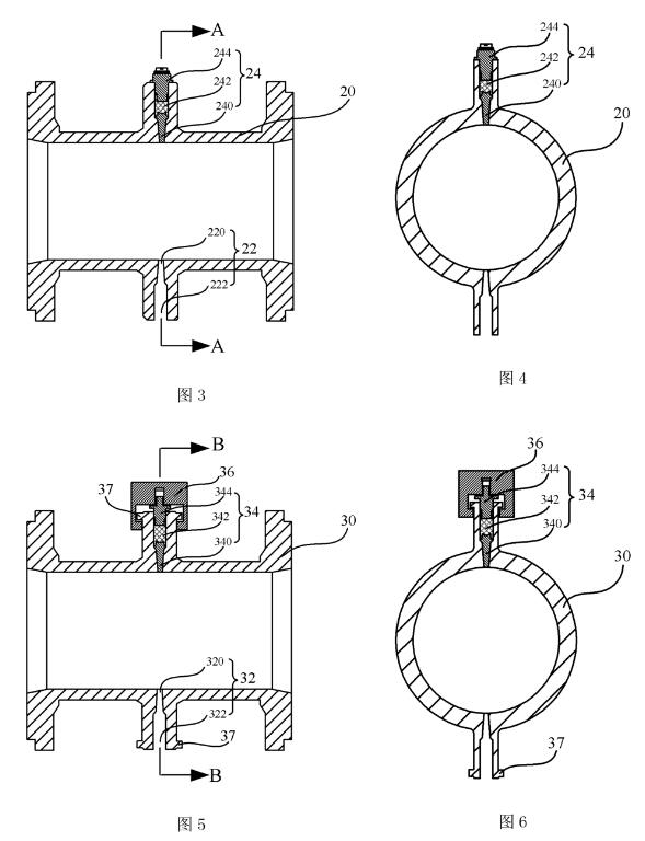 結(jié)合圖3和圖4,所述電磁流量計(jì)傳感器包括:流動有被測流體的陶瓷測量管20于陶瓷測刂量管20的兩個(gè)端面處、作為密封用的法蘭;對向配置在陶瓷測量管20沿著管徑的相對兩端、外凸于所述陶瓷測量管呈凸臺狀的一對電極插孔22;與電極插孔22配合裝配至陶瓷測量管20上的電極構(gòu)件24陶瓷測量管20具有密封端面結(jié)構(gòu),所述密封面可以根據(jù)工況而制成夾持式、法蘭式等連接形式及密封面形式,在實(shí)際應(yīng)用中,陶瓷測量管20與所述密封端面是由陶瓷一體燒結(jié)而成的。具體地,陶瓷測量管20可以是由含量為95%至99%的高純度氧化鋁(即化二鋁,Al202)陶瓷顆粒在高壓高溫下經(jīng)一次燒結(jié)成毛坯,由于這時(shí)硬度還不是很高便于精加工成所述形狀,再經(jīng)過高壓高溫二次燒結(jié)而制作出具有高致密度高強(qiáng)度的陶瓷量管結(jié)構(gòu)件,當(dāng)然,在其他情況下,陶瓷測量管20也可以由其他陶瓷類材質(zhì)如氧化鋯、碳化硅等燒結(jié)而成。