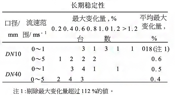 在長達兩年牛的實驗周期內(nèi),每進行一輪試驗,先做一次參比液體和參比條件的基本誤差,k這些數(shù)據(jù)進行比較,即可獲得各臺儀表的長期穩(wěn)定性°表6所示是反映長期穩(wěn)定的基本誤差*大變化量臺數(shù)分布狀況和均變化量。不均量大變化量在014%~018%之間。