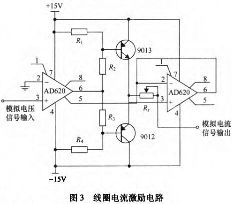 電磁流量計感應電壓檢測模塊主要由勵磁電路和弧狀電極傳感器組成,其中勵磁電路用來在流體測量區(qū)域產(chǎn)生盡量均勻的磁場分布,而內(nèi)嵌在管道內(nèi)壁與流體接觸的弧狀電極傳感器則負責拾取帶有流體速度參數(shù)的感應電壓信號。為在流體測量區(qū)域產(chǎn)生盡可能均勻的磁場,勵磁線圈采用馬鞍形線圈。在勵磁系統(tǒng)設(shè)計中,鐵芯可以提供磁通路徑,從而改變磁場分布,并加強磁感應強度。同時,為降低鐵芯渦流損耗以及增加磁路導磁系數(shù)鐵芯采用表面涂有絕緣漆的薄硅鋼片疊加而成。在鐵芯上套上馬鞍形線圈即組成勵磁系統(tǒng)。直流勵磁使得弧狀電極拾取的感應電壓中存在極化電壓信號,而交流勵磁則會引起的正交干擾和同相干擾。因此,為克服直流勵磁和交流勵磁存在的缺點,設(shè)計采用在線圈中施加頻率∫=6.25Hz的低頻矩形波勵磁方式。勵磁電路主要包括AD620和AD711組成的壓控電流源電路和三極管9013和9012組成的互補對稱推挽型功率放大電路,如圖3所示,模擬電壓信號由PXI模塊的模擬信號輸出端給出。