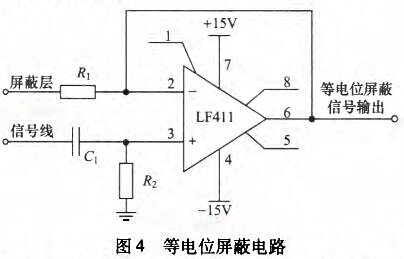 電極之間的感應電壓是非常微弱的交變信號,而且包含各種噪聲干擾信號,因此為有效采集感應電壓信號,檢測信號必須進行信號處理。信號處理模塊主要包括等電位屏蔽電路、前置放大電路、濾波電路、可編程放大電路以及釆樣保持電路幾個部分。為保證外部電磁場不對傳輸信號的信號線產(chǎn)生干擾,采用屏蔽電纜輸出電極上的微弱信號。然而在屏蔽電纜屏蔽層和信號線之間存在著分布電容和分布電阻,其中分布電容一般高于放大器輸入電容,分布電阻幾乎等于放大器輸人電阻,這給信號的檢測帶來很大的影響。采用等電位驅(qū)動屏蔽電纜電路可以避免屏蔽電纜分布電容和分布電阻影響,如圖4所示