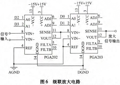 通過調(diào)整電阻R1完成即可設(shè)置增益范圍為1-10000倍的調(diào)整。經(jīng)前置放大電路后,電極之間的電動勢由差動信號變?yōu)閱味诵盘?。因測量電路存在噪聲干擾,前置放大電路輸出信號中存在直流偏置和基線漂移,同時還存在高頻尖峰噪聲,因此需采用濾波電路對雜散信號進行抑制。設(shè)計采用具有低輸入失調(diào)電壓、低輸入偏置電流、高開環(huán)增益和高共模抑制比的OP07組成二階壓控電壓源型高通濾波(截止頻率0.034Hz)和低通濾波(截止頻率72Hz)級聯(lián)電路。濾波電路輸出信號幅度較小,因此需經(jīng)次級放大電路提高增益。設(shè)計采用可編程儀表放大器PGA202與PGA203組成的級聯(lián)放大電路,如圖6所示。