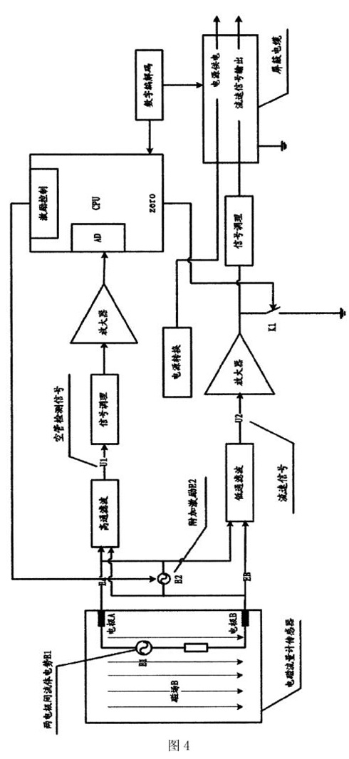 見圖1示意圖中,電磁流量計傳感器在交流勵磁下,產(chǎn)生交變磁場,導(dǎo)電流體在交變磁場中切割磁力線產(chǎn)生感應(yīng)電勢E1,通過屏蔽電纜輸出至遠(yuǎn)端信號轉(zhuǎn)換器的主控制電路板,在主控制電路板上輸出流速信號并顯示見圖3、圖4示意圖中,由CPU控制口產(chǎn)生周期為l6us的高頻激勵,經(jīng)模擬轉(zhuǎn)換為高頻正弦激勵E2,該正弦激勵直接施加在,電磁流量計傳感器的其中一個電極與地或者是兩個電極之間,(圖3是一個電極與地之間施加空管檢測信號的電磁流量計的電路結(jié)構(gòu)圖,圖4是兩個電極之間施加空管檢測信號的電磁流量計的電路結(jié)構(gòu)圖);由此產(chǎn)生被測流體內(nèi)阻Rl的測量信號U1,該測量信號U1與流體內(nèi)阻R1成線性關(guān)系U1=K*R1(K為已知系數(shù))。不可避免的是流體內(nèi)阻測量信號與流體流速測量信號同時存在,二者混在一起,再經(jīng)過高通濾波電路將空管檢測信號提取岀來,此時對流速信號衰減在60dB以上,經(jīng)CPU實時采樣并經(jīng)過數(shù)字濾波后,與設(shè)定的閾值(可調(diào)參數(shù))相比較,若判斷為空管,則CPU發(fā)出zero信號,立刻閉合開關(guān)K1關(guān)閉流速測量信號,使信號轉(zhuǎn)換器顯示為零,否則斷開開關(guān)KI正常輸出流速信號。而電極上流速測量信號經(jīng)過低通濾波電路,此時對空管檢測信號衰減60B以上,再經(jīng)過信號調(diào)理電路后輸出流速信號,實現(xiàn)與空管檢測信號相互分離,從而保證流速測量的準(zhǔn)確度。