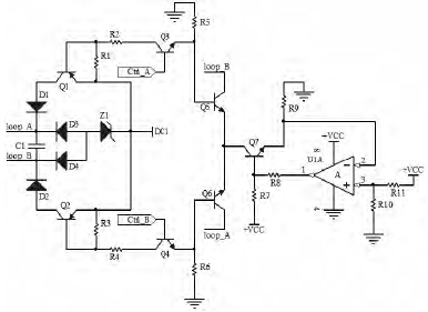圖2為勵磁方波產生電路。Ctrl_A、Ctrl_B為相差半周期的方波控制信號,當Ctrl_A為高電平時,三基管Q3工作在放大區(qū),Ctrl_B端信號為低電平,三基管Q4、Q6截止,Q1用作開關管,工作在飽和區(qū),loop_A端輸出電壓為高電平;Q2工作在截止區(qū),loop_B端電壓低,驅動線圈工作;在Ctrl_A端信號的負半周期,分析情況同上,這樣,就得到了低頻矩形方波。U1A和Q7及電阻構成了恒流源,+VCC為Q7提供基基偏置電壓,R9上流過的電流大小是恒定的。這樣,Ctrl_A、Ctrl_B端方波相差半周期使得上下兩部分的對稱電路交替導通,并且產生穩(wěn)定的勵磁電流,驅動線圈工作,達到恒流勵磁的目的。DC1提供高電壓,反向串聯(lián)穩(wěn)壓管Z1,輸出穩(wěn)定電壓,保證磁基輸出方波勵磁信號時低電壓不至過低。