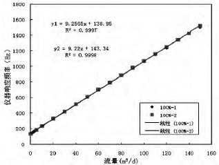 在大慶油田進行了模擬井實驗,對電磁流量計系統(tǒng)進行了動態(tài)測試,結果如圖4所示。其中橫軸表示測量系統(tǒng)中流體通過的體積流速,用流體體積與天數之比表示,單位是m3/d;縱軸表示儀表響應頻率的值,單位是Hz。