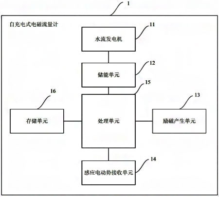 為實(shí)現(xiàn)上述目的及其他相關(guān)目的,本儀表是提供一種自充電式電磁流量計(jì),其至少包括:設(shè)置在水流經(jīng)過(guò)的管道內(nèi)的水流發(fā)電機(jī),其殼體的入水口呈喇叭狀,該殼體內(nèi)設(shè)有葉輪、齒輪增速單元、永磁直流發(fā)電機(jī);與所述水流發(fā)電機(jī)連接的儲(chǔ)能單元;用于基于控制信號(hào)來(lái)產(chǎn)生磁場(chǎng)的勵(lì)磁產(chǎn)生單元;用于基于所述勵(lì)磁產(chǎn)生單元產(chǎn)生的磁場(chǎng)來(lái)產(chǎn)生相應(yīng)感應(yīng)電動(dòng)勢(shì)的感應(yīng)電動(dòng)勢(shì)接收單元;與所述勵(lì)磁產(chǎn)生單元、感應(yīng)電動(dòng)勢(shì)接收單元及儲(chǔ)能單元連接且用于輸出所述控制信號(hào)及將所述感應(yīng)電動(dòng)勢(shì)接收單元輸入的數(shù)據(jù)進(jìn)行處理的處理單元;以及與所述處理單元連接的存儲(chǔ)單元。