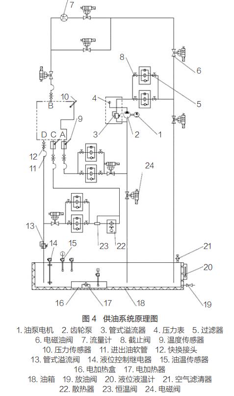 試驗臺供油系統(tǒng)用于提供變速器試驗所需的油壓和流量,保證油溫處于變速器的正常工作范圍內。供油系統(tǒng)原理如圖 4 所示。通過計算機控制系統(tǒng)控制,可實現(xiàn)變速器試驗全過程油液循環(huán)過濾、保溫、濾清器堵塞報警等功能。