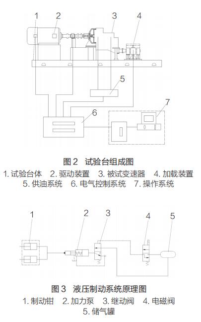 變速器超越離合器可靠性試驗臺主要由試驗臺體 1(試驗平臺、驅動電機支座、前支座、后支座)、驅動裝置 2(驅動電機、聯(lián)軸器)、被試變速器 3、加載裝置 4(液壓制動系統(tǒng))、供油系統(tǒng) 5、電氣控制系統(tǒng) 6、