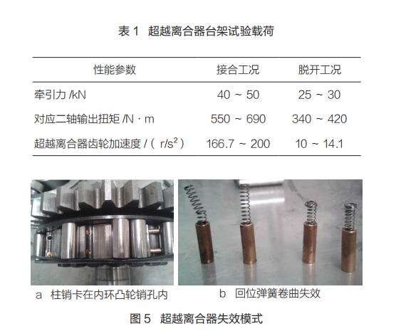 在試驗臺上模擬渦街流量計常見工況的傳動系載荷譜,臺架試驗 1h 等效于整機試驗 1.8h。利用試驗臺進行了 4 次累計600h 的試驗,超越離合器失效模式如圖 5 所示。超越離合器失效主要表現(xiàn)為柱銷卡死在內環(huán)凸輪銷孔中,彈簧卷曲、斷裂,以及內環(huán)凸輪滾道壓痕明顯,與市場反饋的失效模式基本一致。該試驗臺對市場故障具有很好的再現(xiàn)性,極大縮短了故障驗證時間,減少了整機試驗時的排放和噪聲污染,具有良好的經(jīng)濟效益和社會效益。■
