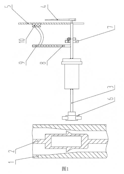 參見(jiàn)圖1、圖2,一種金屬轉(zhuǎn)子流量計(jì)的組合結(jié)構(gòu),包括測(cè)量系統(tǒng)和位移傳感裝置,測(cè)量系統(tǒng)包括錐管1和位于錐管1中的磁性浮子2,位移傳感裝置包括指針組件、刻度盤5和轉(zhuǎn)換器,其中,指針組件包括轉(zhuǎn)動(dòng)軸3、感應(yīng)磁鋼6和指針4,感應(yīng)磁鋼6固定在轉(zhuǎn)動(dòng)軸3的一端,該感應(yīng)磁鋼6靠近所述磁性浮子2,且感應(yīng)磁鋼6的磁場(chǎng)方向與磁性浮子2的磁場(chǎng)方向相反,指針4固定在轉(zhuǎn)動(dòng)軸3的另一端,其中,磁性浮子2的上端為N極,磁性浮子2的下端為S極,感應(yīng)磁鋼6的上端為S極,感應(yīng)磁鋼6的下端為N極。轉(zhuǎn)換器包括角位移磁鋼7、線性角位移傳感器8、集成電路板9和液晶顯示器10,液晶顯示器10固定安裝在刻度盤5上,角位移磁鋼7呈圓環(huán)狀,角位移磁鋼7固定在轉(zhuǎn)動(dòng)軸3上,線性角位移傳感器8固定在集成電路板9上,線性角位移傳感器8靠近角位移磁鋼7,集成電路板9與液晶顯示器10之間通過(guò)數(shù)據(jù)線連接。